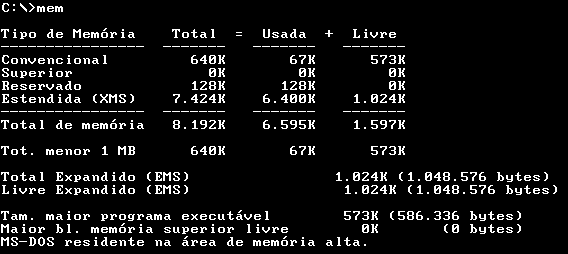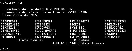 O comando dir apresenta, ainda, três informações bastante importantes ao seu final: o número de arquivos contidos no diretório corrente, o espaço em disco ocupado por estes arquivo(s) e o espaço disponível no disco (espaço livre para gravação de arquivos).