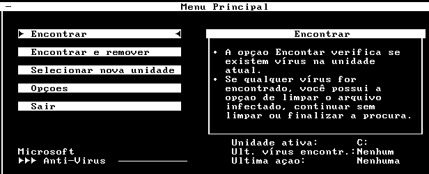 O antivírus do MS-DOS detecta a maioria dos vírus conhecidos e assim que ele encontre um vírus, o informará. Para procurar e remover algum vírus existente na sua máquina, use o botão encontrar e remover.